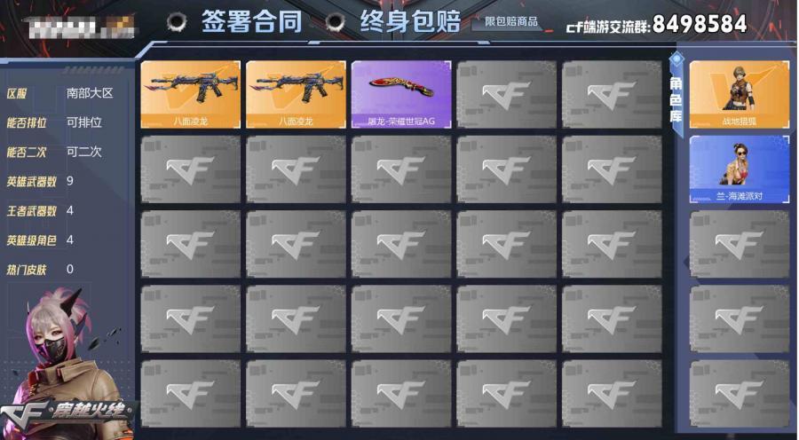 【可二次 英雄武器数量:9 英雄角色数量:4 王者武器数量:4 兰-海滩派对,战地猎狐 屠龙-荣耀世冠AG 稀有武器:1个 】