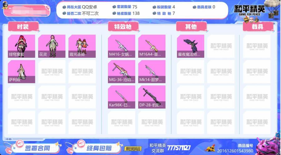 hs63189 安卓手Q-2王牌印记-4粉装-7特效枪-39447热力值-75套装-138枪皮 【4粉装】角色-花灵,角色-绯穹魔姬,角色-萨利娅,套装-霞光圣骑 【7特效枪】